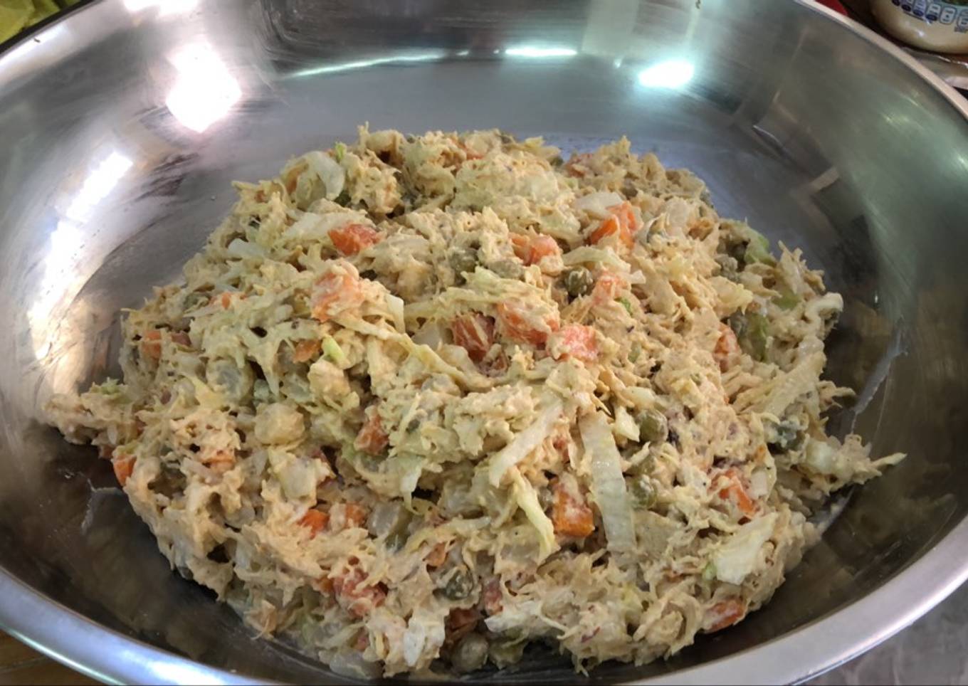 - Mezclar todos los ingredientes : Zanahoria y papá picada cocida en agua, Lechuga rallada y desinfectada, lata de chícharos pimienta, Sal, Chipotle y la mayonesa