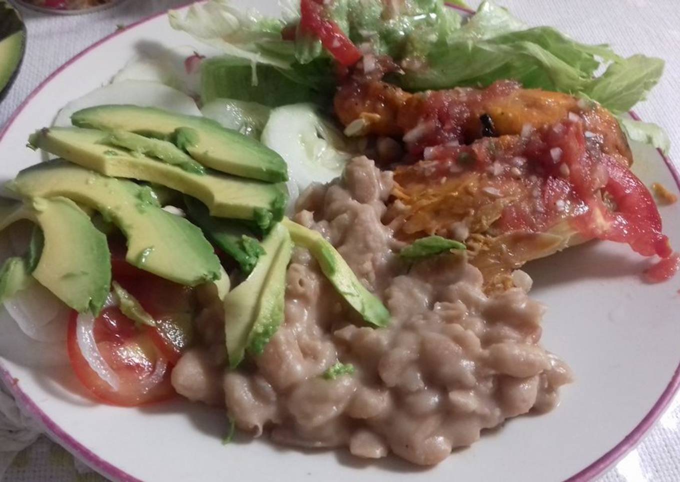 - Para servir ponemos dos piezas de pollo, frijolitos, cebolla y jitomate bañados con jugo de limones y sal espolvoreada y unas rebanadas de aguacate. Se acompaña con salsita martajada y tortillas calientes.