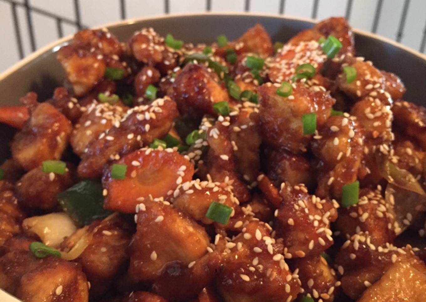 - Agregar 2 cucharadas de aceite en un sartén grande o un wok caliente, después agregar ajo, jengibre, dejar freÃr por unos segundos agregar cebollÃn, después agregar los ingredientes de la salsa, que son, salsa de soya, salsa de tomate, miel de abeja, y vinagre de manzana, una vez que empieza a hervir a fuego alto agregar pollo frito, zanahorias, cebollitas y pimientos y mezclar por unos minutos.