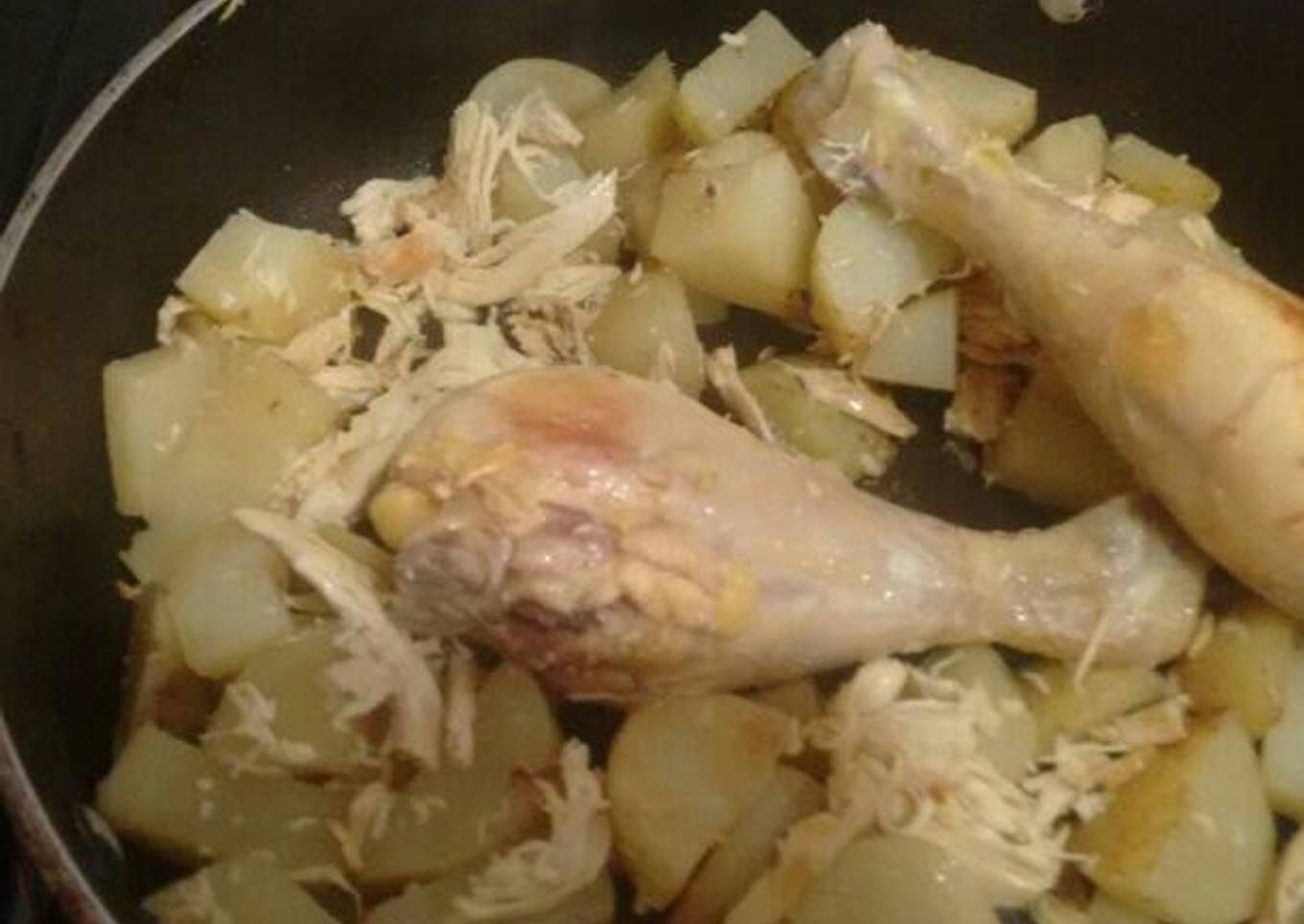 - Retira las patatas, cebolla y agrega el pollo. Si es necesario, pon más aceite de ajo, dora muy bien.