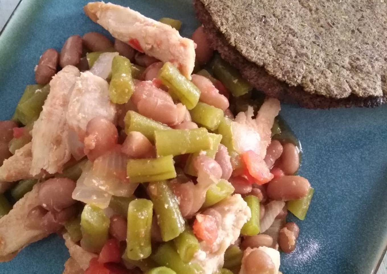 - Cuando ya casi están las fajitas le agregamos la cebolla y el tomate y le ponemos sal, meneamos y le agregamos los ejotes cuando ya estén cocidos, ponemos las cucharas de frijoles también ya cocidos meneamos y listo a disfrutar.