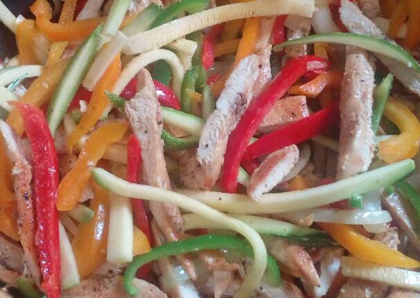 - Si te gusta bien cocido todo espera un par de minutos, de lo contrario solo da un par de vueltas y agrega las fajitas de pollo y un par de gotas de jugo maggi.