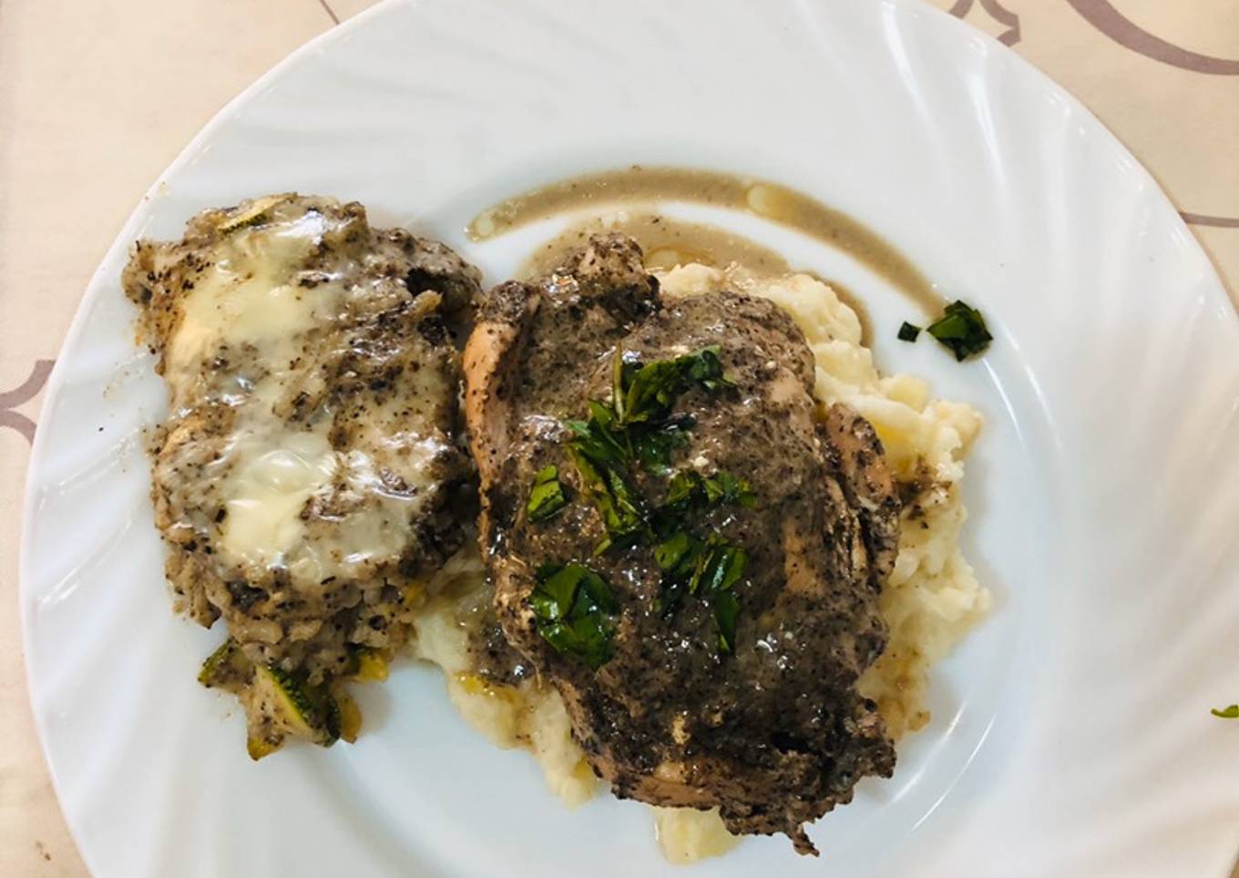Pechuga de Pollo rellena con champiñones al ajo y queso Crema, sobre cama de Puré de Papa
