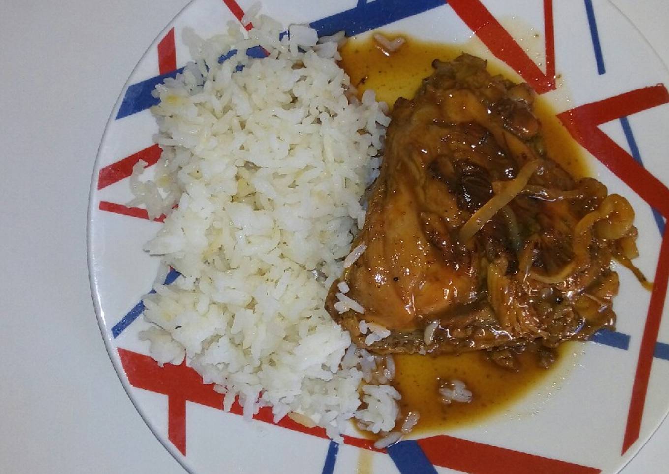 - En el mismo aceite donde se frĂo el pollo sofreĂmos la cebolla y cuando ya este suavecito la cebolla le agregamos el knorr suiza y lo revolvemos bien, despuĂ©s le agregamos 3 cucharadas de catsup y lo revolvemos para que se integre bien todo.