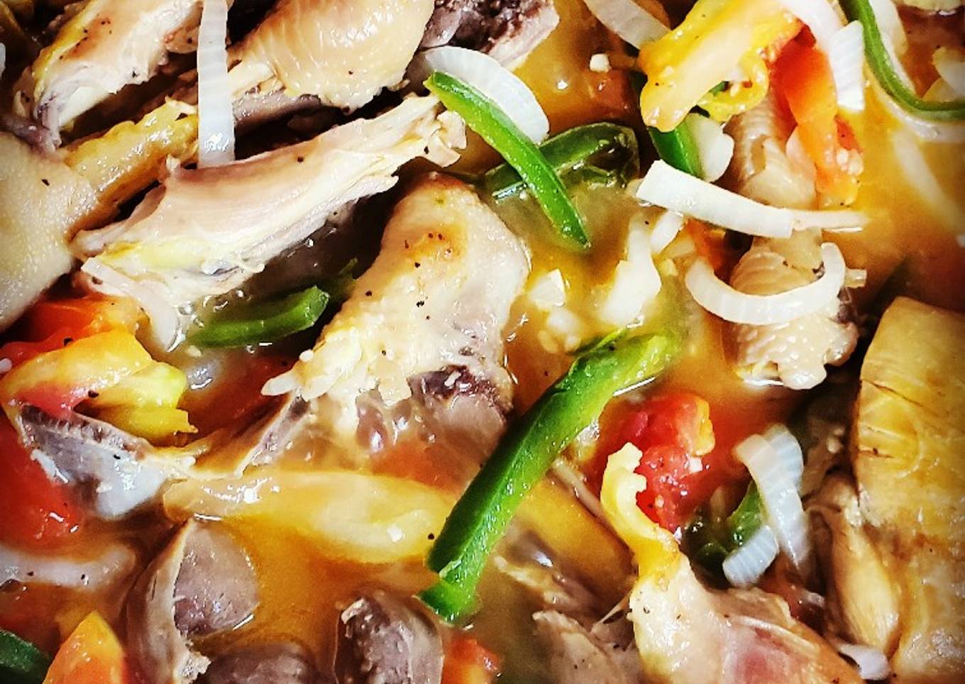 - Agregamos las piezas de pollo a dorar solo un poco y agregamos primero la cebolla y luego el resto de los ingredientes y 200 ml del caldo del pollo, tapamos cuando suelta el primer hervor destapamos y a fuego medio dejamos reducir el caldo y listo a disfrutar