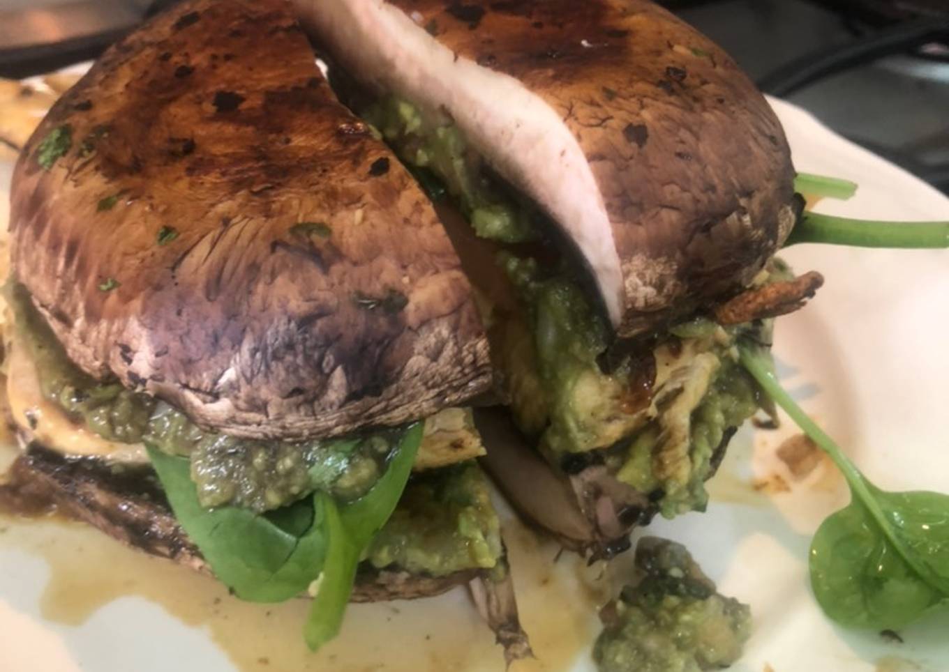 - Untamos en uno de los lados internos del hongo el aguacate que preparamos, agregamos las fajitas de pollo, queso,, jitomate, espinacas y listo para servir
