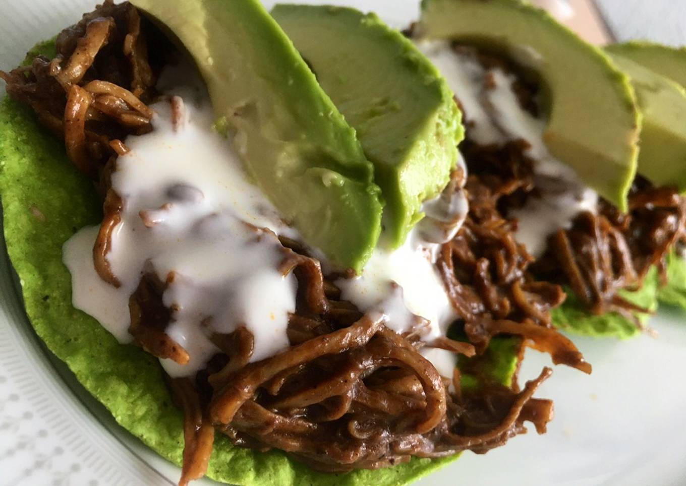- En un plato colocamos nuestras tostadas y servimos el mole. Lo acompañamos con crema y aguacate. Yo le agregué una pizca de sal al aguacate para más sabor jeje. Buen provecho 😊